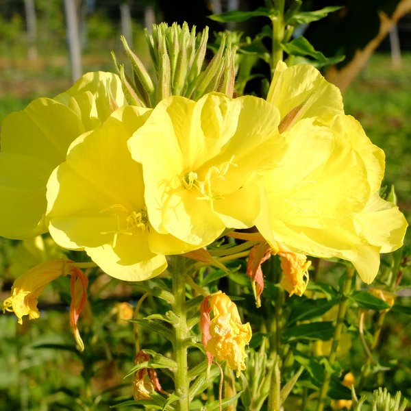 Bisannuelle buissonnante dont les fleurs jaunes s'épanouissent à la tombée de la nuit en un quart d'heure ! Se ressème facilement sans être envahissante. Hauteur 1.50m.