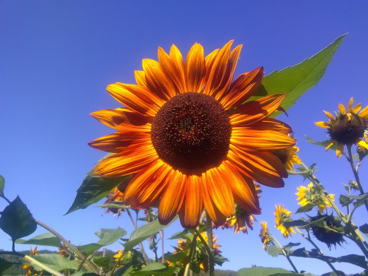 Tournesol ramifié de 2m de haut ; les fleurs sont rouges foncées, avec un cœur noir entouré d'un anneau plus clair